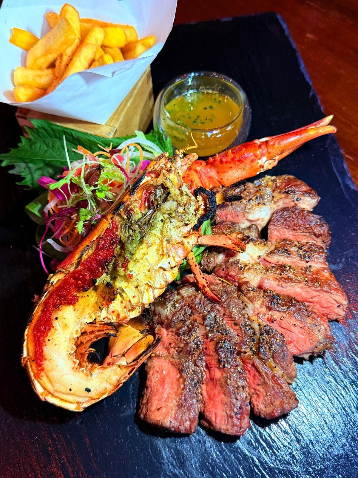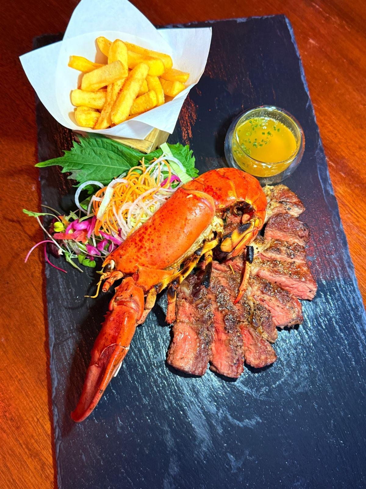 Savour a generous cut of perfectly cooked steak, served with a half lobster grilled to perfection, golden fries, and a fresh herb salad. A combination of land and sea designed to impress your taste buds and elevate your weekend.